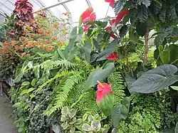 The conservatory built up its specialty plant collections through donations from individuals. Between its glass ceilings and walls, the conservatory displays thousands of living specimens for public viewing, while thousands of additional specimens are cultivated in the adjacent greenhouses. Four of the conservatory's five display houses – bromeliad, fern, palm, and cacti and succulents – feature plants from a single plant primarily along with other accent plants. A fifth house, the seasonal house, features different plants based on the season.