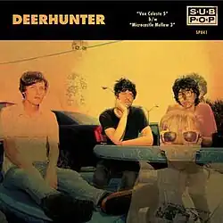 "Vox Celeste 5" is a Deerhunter single released as part of the third edition of Sub Pop's Singles Club.[1] Units were set to ship out in June 2009, but due to delays were not released until August 28.[2] The records were pressed in a limited set of 1,500 on yellow vinyl. The tracks that appear here are re-workings of songs that initially appeared on Microcastle and Weird Era Cont. To date, it is the only release by Deerhunter to appear on Sub Pop.