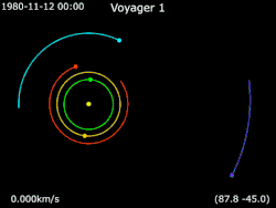 - ^ Horizons Archived October 7, 2012, at the Wayback Machine, JPL Solar System Dynamics (Ephemeris Type Elements; Target Body: Voyager n (spacecraft); Center: Sun (body center); Time Span: launch + 1 month to Jupiter encounter – 1 month)
