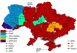 The Supreme Soviet election, the first multi-party vote in Soviet Ukraine's history, was held on 4 March 1990. It was marked by high turnout, with 85% of registered voters participating. In most of Ukraine, the result was beneficial for the communists, with 90% of previously-elected deputies being re-elected and 373 of 450 deputies belonging to the Communist Party. In all three Galician oblasts,[e] however, the Democratic Bloc, a Rukh-led coalition,[99] won the majority of seats. Ivan Plyushch, who was elected as Deputy Chairman of the Supreme Soviet, wrote in 2010 that the communist majority was unable to command the same influence at a parliamentary level as the Democratic Bloc was.[100] Chornovil was elected as a Democratic Bloc deputy from the city of Lviv's Shevchenkivskyi District by an absolute majority, winning 68.60% of all votes against seven other candidates.[101] Within the Supreme Soviet Chornovil was among the leaders of the Democratic Bloc's radical wing.[98]