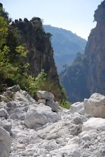 The Vyros Gorge (Greek: Φαράγγι του Βυρού) is a deep river gorge in the Taygetus Mountains on the Mani Peninsula in the Peloponnese in southern Greece. The gorge runs from the foot of Mount Taygetus (known locally as "Profitis Ilias") to the town of Kardamyli on the Messenian Gulf. In summer it remains dry but can flood spectacularly in the winter, turning into a river and transporting tree branches and rocks to its mouth in Kardamyli.