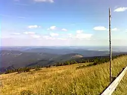 A characteristic feature of the mountain is its almost flat, arc-shaped summit ridge, about 900 meters long, stretching from the south to the northeast. The ridge appears as a slightly "jagged crest" when viewed from the west or east.[3] Vysoká hora is a recognizable mountain, visible from the road from Zlaté Hory to Šternberk, where its slope can be seen. It is also visible from various summits, including Karliny kameny and Sokol, where it can be spotted in the line of sight towards Lyra. The summit is easily identifiable from the road around the summit of Praděd but hidden from the road circling Dlouhé stráně, obscured by Praděd.[4]