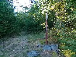 Vysoká hora has a secondary summit.[3] About 1.2 km east of the main summit lies the secondary peak, known as Vysoká hora–V, with an elevation of 817 meters above sea level and geographic coordinates 50°05′50.9″N 17°22′06.5″E / 50.097472°N 17.368472°E. It is separated from the main summit by a low pass at 816 meters above sea level.[7] The secondary summit is situated in dense mixed forest.[8] Due to the forest cover, it is not a viewpoint and does not feature a triangulation station.[7]