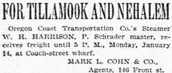 - ^ a b "For Tillamook and Nehalem …". Sunday Oregonian. Portland, OR. Jan 13, 1895. p. 7 col. 1.