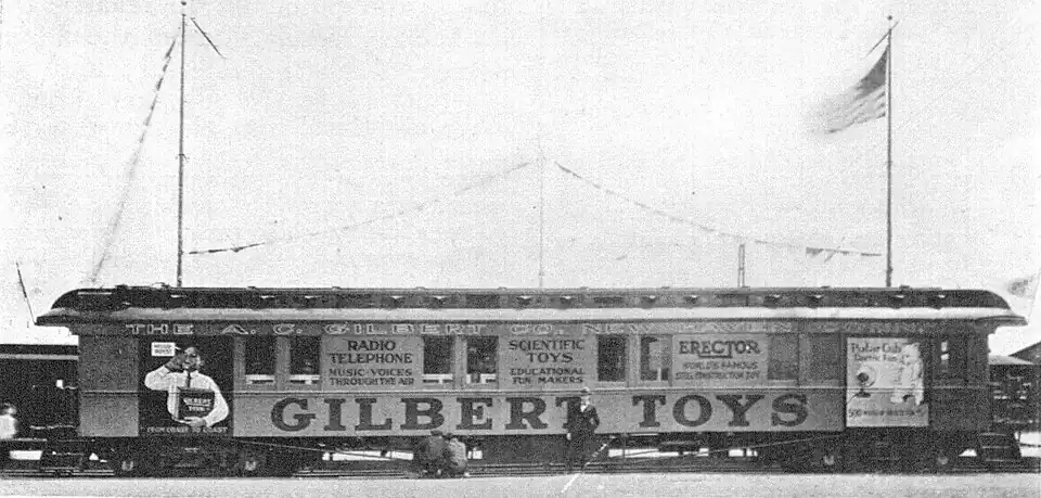 - ^ "A Railroad Car Serves as an Off-Season Booster of Sales" by James M. Mosely, Printers' Ink Monthly, June 1922, page 23. "Painted bright yellow and red, with a green roof, this car is designed to get the interest of the boy who is the prospect for Gilbert toys."