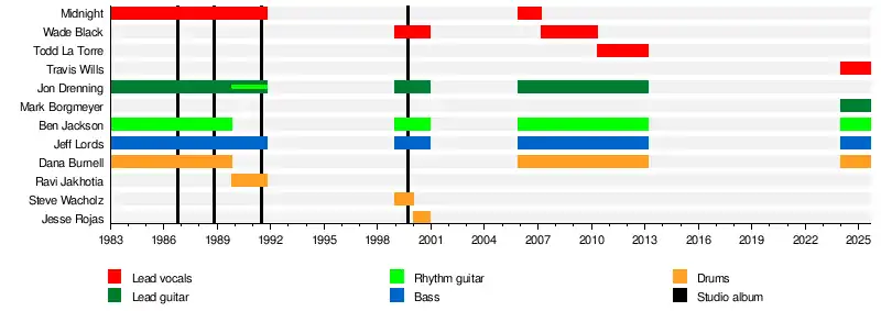 On July 8, 2009, in hospital with family, friends and bandmates by his side, former singer Midnight died at 3:30 am.[30] Although the press initially stated total kidney and liver failure, the real cause of death was a stomach aneurysm.[31] In memory of their fallen friend and bandmate, Midnight, the band played a tribute show, headlining 2009's ProgPower in Atlanta, Georgia.[32] The show featured many special guest vocalists, including Lance King from Pyramaze, Nils K. Rue from Pagan's Mind, Chris Salinas from Zero Hour, Ronny Monroe from Metal Church, Andy Franck from Brainstorm, Sean Peck from Cage, Danilo Herbert from Mindflow, Joakim Brodén from Sabaton, Michael Eriksen from Circus Maximus, Rob Rock, Mark Boals from Royal Hunt, Clay Barton from Suspyre, Kelly Sundown from Beyond Twilight and their former vocalist, David Van Landing.[33] A few weeks prior to the show, Jon Oliva's Pain guitarist, Matt LaPorte, introduced Todd La Torre to the band and he was added as a guest vocalist at ProgPower X.[34]