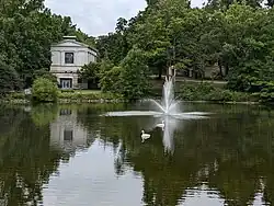 The site selected for the chapel was between two existing lakes, diagonally across a road from the existing public receiving vault.[2][3][4] There was a slight hill here,[5][6] and the structure was designed so that the crypt level could not be seen from the driveway that led to the front of the chapel.[6]