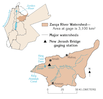 The new Jerash Bridge crosses the Zarqa upstream of King Talal reservoir, on the road from Amman to Jerash. The bridge is the site of a gauging station where flow measurements are continuously taken.