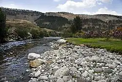 Archaeological finds of charcoaled remains indicate that poplar and tamarix used to grow along the banks of the Zarqa, with forests of wild oak growing on the hillsides.[22] Today, tamarix thickets are still widespread in the floodplains, and the banks are cultivated with fruit orchards and vegetable fields. Along the course of Zarqa River, water is pumped directly and used to irrigate crops of leafy vegetables such as parsley, spinach, cabbage, cauliflower and lettuce, as well as potatoes. Olive trees are also found along the river's banks.[23] Tulips grow on many hillsides of the river,[24] while in the springs area and the watercourse, water vegetation is found.[25] Natural pine forests grow in the King Talal Dam area.[18] Along the upstream banks, where the river runs wild, one finds the common reed, oleander and Typha species.[17]