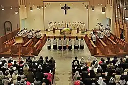 By 1956, the monastery had been raised to a simple priory under Bitterli's leadership. On February 17, 1964, the monastery became an abbey. At this time, Fr Odo Haas was elected the community's first abbot. During Haas' reign, dependent houses were established in Busan and in Daegu. In 1971, Haas was succeeded by Fr Placidus Ri, who thus became the first ethnically Asian superior of a Missionary Benedictine monastery. Under Abbot Placidus, a new abbey church was constructed in 1975, and the monastery's printing and publishing endeavors were expanded and modernized. Additionally, Abbot Placidus oversaw the expansion of Waegwan Abbey's foundation in Seoul, which was enlarged from a study house for clerics to include a retreat center and a branch for the Waegwan Publishing House. In 1985, monks from Waegwan were sent to the Philippines to assist the fledgling monastic community in Digos.[2]