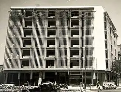 Shortly after graduating from the Beaux-Arts he won the 1954 international competition for the design of the national broadcast headquarters in Damascus. Later that year he was named architecte en chef, chief architect, of the Directorate-General of Antiquities and Museums in Damascus. During this time, in addition to his art atelier, he maintained a successful architectural practice and organized archaeological and historic preservation initiatives. His architectural work in the 1950s is recognized as influential in contemporary Levant architecture. Alexander Prokhorov cites that "architects such as Wahbi Al-Hariri sought solutions that would reconcile modern industrial designs with national forms."[25] He designed several large projects in the 1950s.[10] In 1956 he won the design of the Adnan al-Malki memorial in the heart of Damascus.[21] By 1959 his reputation had grown such that he was invited by the Association of German Architects and Engineers to lecture on contemporary Syrian art and architecture at the universities of Bonn, Hanover, Hamburg, Berlin, and Frankfurt.[10][26]