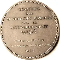 In 1954 Wahbi al-Hariri received his architectural DPLG with honors and was awarded the highly coveted Prix du Meilleur Diplôme by the Société des Architectes Diplômés par le Gouvernement. The award, presented with a medal struck in bronze—which was designed for the société in 1896 by Louis Bottée—was bestowed annually upon the preeminent graduating student of architecture.[3][23]