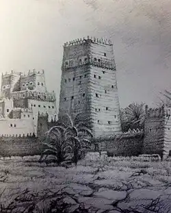 Al-Hariri's first major commission in Saudi Arabia was the 1965 design of an extensive master-plan for the new campus of the university in Medina which was executed under his supervision. His design made allowance for future growth and has informed the university's expansions over the years.[31] In his capacity as chief architect, al-Hariri designed and led projects all over the Kingdom. As he traveled throughout the country, al-Hariri grew increasingly interested in the history and culture of Arabia.[30] In the late 1960s the many facets of the Arabian Peninsula's heritage were unknown and, as is possible with fast-paced development, were in danger. Al-Hariri resolved to preserve and document the kingdom's traditional architectural and artistic heritage and in the 1970s he embarked on explorations throughout the region to "document the diversity of architectural styles, building materials and geographic regions that exist in Saudi Arabia."[32] After years of travel and research, "Al-Hariri produced a collection of superb drawings that has been hailed as one of the finest records of Saudi Arabia's architectural past", wrote Helen Khal; his "drawings are more than illustrations of old buildings and historical monuments. They reveal a devotional bond between artist and subject in a creative process." The drawings were the product of "intensive travel throughout the kingdom to draw on location. For months at a time, he would travel to remote towns and villages, carrying with him only his art supplies."[33]