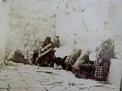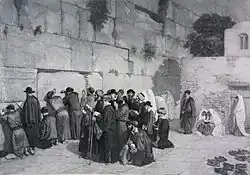In the late 1830s a wealthy Jew named Shemarya Luria attempted to purchase houses near the Wall, but was unsuccessful,[48] as was Jewish sage Abdullah of Bombay who tried to purchase the Western Wall in the 1850s.[49] In 1869 Rabbi Hillel Moshe Gelbstein settled in Jerusalem. He arranged that benches and tables be brought to the Wall on a daily basis for the study groups he organised and the minyan which he led there for years. He also formulated a plan whereby some of the courtyards facing the Wall would be acquired, with the intention of establishing three synagogues—one each for the Sephardim, the Hasidim and the Perushim.[50] He also endeavoured to re-establish an ancient practice of "guards of honour", which according to the mishnah in Middot, were positioned around the Temple Mount. He rented a house near the Wall and paid men to stand guard there and at various other gateways around the mount. However, this set-up lasted only for a short time due to lack of funds or because of Arab resentment.[51] In 1874, Mordechai Rosanes paid for the repaving of the alleyway adjacent to the wall.[52]