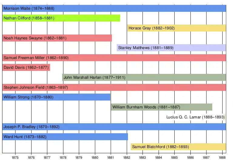 The Waite Court confronted constitutional questions arising from the Civil War, Reconstruction, the expansion of the federal government following the Civil War, and the emergence of a national economy linked together by railroads.[2] The Waite Court issued several major decisions, including Cruikshank, that denied the federal government the power to protect the civil rights of African Americans.[3] However, historian Michael Les Benedict notes that the civil rights decision were made during the era of dual federalism, and the Waite Court was sincerely concerned with maintaining the balance of power between the federal government and state governments.[4] While the Waite Court struck down civil rights laws, it upheld many economic regulations, in contrast with the Fuller Court.[5]