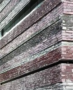The exterior of the building is clad in multi-coloured slate collected from Welsh quarries. Narrow windows are built into the layers of slate to give the impression of rock strata in sea cliffs. The purple slate came from the Penrhyn Quarry, the blue from Cwt y Bugail Quarry, the green from the Nantlle Valley, the grey from Llechwedd quarry, and the black from the Corris Quarry.[29]
