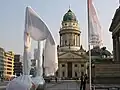 The sculpture "Meisterwerke der Musik" (Masterpieces of Music) consisted of six individual notes, three quavers and three crotchets. Each note was 8.10 m (26.6 feet) high, 5.4 m (18 feet) long and 2.1 m (6.9 feet) wide and weighed 8.6 tonnes (9.5 short tons), including the flag. According to the website Land der Ideen (Country of Ideas) the notes were, due to their static and geometric aspects, by far the most complicated construction of all six sculptures.[5] A crane was used to assemble the individual parts, the note heads and stems, on May 5, 2006, at the Gendarmenmarkt.