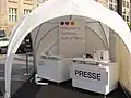 The ceremonial inauguration of the sculpture Milestones of Medicine took place on March 30, 2006, at the Friedrich-Ebert-Platz which is located just east of the Reichstag. It was in the shape of a pill and, with a diameter of 10 m (33 feet), was impossible to overlook on the waterside promenade of the Spree across the Marie-Elisabeth-Lüders-Haus which houses the Library of the German Parliament. The 25-tonne (28-short-ton) sculpture was anchored below the pavement by a steel base which measured 4.20 m × 4.20 m × 1.00 m (13.78 by 13.78 by 3.28 feet).