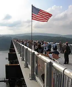The opening ceremony of the Walkway Over the Hudson State Historic Park was held on October 3, 2009, as part of wider NY400 celebrations, featured music by Pete Seeger, and was attended by Governor David Paterson, Senator Chuck Schumer, Congressman Maurice Hinchey, president of nearby Vassar College Catharine Bond Hill,[53] John May, engineer of the last train across the bridge, and other officials. Paterson said, "This bridge is now the longest footbridge in the world."[8]