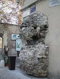 The only surviving piece of the 13th century fortifications is a small fragment of the outer wall at the junction of rue Joseph-Vernet with rue Saint-Charles.[14] Much of the path of the double defence is preserved in the city plan as modern streets follow what was once the gap between the two city walls. Working clockwise from the northeast the walls followed the rue des Trois-Colombes, the rue Campane, the rue Paul-Saïn, the rue Philonarde, the rue des Lices, the rue Henri-Farbe, the rue Joseph-Vernet and the rue Grande-Fusterie.[10] The path of early walls in northwest corner of the town near the Pont Saint-Bénézet is obscure due to the subsequent changes to the fortifications in this important area.[15]