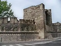 In the 18th century the walls continued to be maintained up to the time of the French Revolution and three of the seven gates were rebuilt. The Porte de la Ligne at the north of the town was judged to be too narrow. In 1755–1757 a new gatehouse designed by the architect Jean-Pierre Franque was built 50 metres west of the old gate at the end of Rue Palapharnerie. The new gate replaced a small tower. The old gatehouse was demolished and replaced by another small tower.[47][48] In 1760 the Porte du Rhône, to the south of the Saint-Bénézet bridge, was demolished and rebuilt in a classical style. The new gate was again designed by Franque.[49] In 1783 the Porte de l'Oulle, to the west side of the town, was demolished and rebuilt 20 metres to the north of its original position, opposite La Comédie theatre on the other side of the Place Crillon. Vestiges of the arch of the original gate are still visible on the interior surface of the wall. The design was by the architect Jean-Baptiste Péru. The new gate no longer survives: it was demolished in 1900.[50] During this period the battlements were repaired between Porte Saint Roch and Porte d'Oulle as well as between Porte de la Ligne and Porte Saint-Lazare.[45]