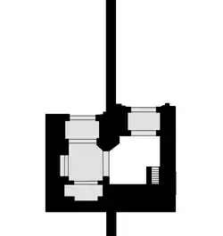 The main structure of the gate is a bastion inside which a bent passage enters from the north, performs a 180-degree turn, and then exits again to the north.[3][2] Today, the walls in the area have been moved around the gate's bastion such that both entrances of the gate, facing north, open inside the city walls, obscuring its original role as an entrance to the city. However, when the gate was studied by French scholars in 1912 the surrounding city wall had a different configuration: rather than attaching to the side of the gatehouse it attached to the middle of the gate's northern facade, between its two doorways, such that the eastern doorway was outside the city wall while the western one was inside the walls. Since both entrances still faced north, this meant that the outer entrance was not actually directly visible to outsiders coming from the countryside because it faced back towards the city walls; as a result, travelers arriving from the south had to walk all the way around to the far side of the bastion and enter it from the north.[3] Because of this uncharacteristic configuration, and based on comparisons with other gates of the city, Wilbaux has hypothesized that the city's ramparts in this area were previously altered and moved around the gate such that the entrances were originally reversed: the eastern doorway, which was the outer entrance in 1912, was originally located inside the city walls, while the western doorway (the inner entrance in 1912) was originally outside the city walls. This way, the bastion of the gate straddled the city wall and its design was thus quite similar to the original configuration of Bab Aghmat, the other southern gate of the city.[2]: 199–201