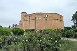 Bab al-'Arisa (meaning "Gate of the Bride"; also spelled as Bab Larissa or Bab Lrissa) is also known as Bab al-'Arais ("Gate of the Fiancés") and formerly as Bab ar-Raha (Raha possibly meaning "abundance" or "well-being"; it is also a surname in Marrakesh).[3][2] It is the other western gate of the city, located north of Bab el-Makhzen in an angle of the ramparts, and dates back to the Almoravid period.[3] Like Bab al-Makhzen to the south, the gate is flanked by octagonal towers and originally had a simple bent passage (turning 90 degrees to the north), but has since been modified. It was walled-up at the beginning of the 20th century but today it has a simple opening through which a local road passes.[2]
