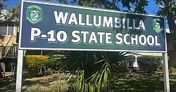Wallumbilla State School is a government primary and secondary (Kindergarten to Year 10) school for boys and girls at 22 High Street (26°35′03″S 149°11′10″E / 26.5843°S 149.1861°E).[21][22] In 2016, the school had an enrolment of 106 students with 15 teachers (12 full-time equivalent) and 10 non-teaching staff (7 full-time equivalent).[23] In 2018, the school had an enrolment of 126 students with 16 teachers (12 full-time equivalent) and 13 non-teaching staff (8 full-time equivalent).[24]