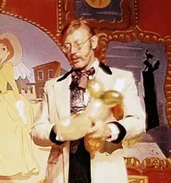 ![]() Wally Boag constructing one of his signature "Boagaloons" at the Golden Horseshoe Revue in the early 1970s. | |
