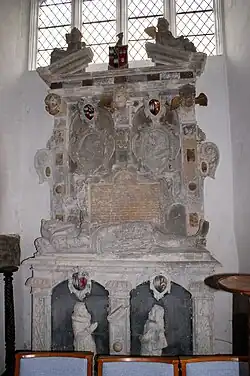 - Thomas Erle (d.1597), eldest son,[14] whose large effigy dressed in full-armour and kneeling on one knee in prayer, survives (re-positioned) in St Mary's Church, Morden, Dorset, the parish church of Charborough House. In 1581 at Shute in Devon, he married Dorothy Pole, a daughter of his father's near neighbour William Pole (1515–1587), Esquire, MP, of Shute House in the parish of Shute, near Colyton, Devon. Dorothy's brother was the Devon antiquary and historian Sir William Pole (1561–1635) whose principal seat was Colcombe House in the parish of Colyton, the former residence of Walter Erle of which mansion house and deerpark a lease had been granted to him by the Queen Katherine Parr. Pole describes various of the Erle family's landholdings in his work Collections Towards a Description of the County of Devon.[26] Dorothy's mother was Katherine Popham (died 1588), the sister of John Popham (1531–1607), Lord Chief Justice. Dorothy survived her husband and remarried to Sir Walter Vaughan (c.1572–1639), of Falstone (alias Fallersdon) in the parish of Bishopstone, Wiltshire, Sheriff of Wiltshire in 1599–1600 and a Member of Parliament for Wiltshire in 1606.[27] Thomas Erle commenced building a pier at Axmouth,[28] which manor had been acquired by his father. By his wife he had children including: