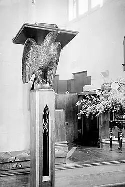 - Carved mitre, relief panel of eagle on a lectern, and St Alban's shield, Anglican Cathedral Church of St. Alban the Martyr, Griffith, New South Wales