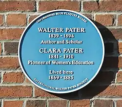 - Blue plaque to Walter & Clara Pater on their home in Bradmore Road, Oxford, UK: Oxfordshire blue plaques.