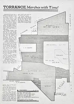 Oil was discovered on the Kettler ranch in 1924 and there were ultimately 48 wells on the site.[2] Walteria was formally annexed to the city of Torrance, California on March 12, 1928.[9] In 1929 the Walteria post office became a branch of the Torrance office, perhaps in part because the Walteria postmaster had been convicted of embezzling $1,200 in funds from the post office department.[10] The Walteria branch of the Torrance library system first opened in 1937.[11] The first location of the Walteria library was an old army barracks.[2] During World War II, a citizens committee worked to supply the library with books in honor of the 111 people from Walteria serving the armed forces.[2] The library moved around and operated at a number of locations until it moved into a dedicated building in 1962.[11]