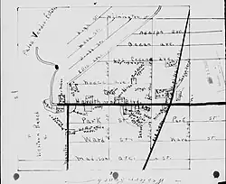 Walteria is named after Captain A. Richard Walters of Atkinson, Illinois.[4] Walters moved to the California farming area in the 1880s and built a stagecoach stop on the Redondo–Wilmington road connecting the salt works in Redondo Beach with the harbor in San Pedro.[5] In 1888, real estate developers advertised Walteria as a subdivision of Meadow Park that offered "pure air and delightful scenery" to potential buyers.[6] The name was apparently because "developers recognized the pleasing quality of the Spanish language. They named their subdivision either a truly Moorish Alhambra, a Spanish-sounding Moneta, or simply gave it a Spanish ending as in Walteria."[7] According to a 1949 history of Rancho Palos Verdes, "On the northern side of the ranch, abortive cities of grand scale [were] plotted, including the subdivision named Walteria on the property of [N. A.] Narbonne and Weston. Attractive as the plans appeared, the construction of these works was not consummated before the collapse of the boom, so the ranch lands remained planted in grain and devoted to grazing of sheep, except for a few scattered sales in the different tracts, and the growing San Pedro town. Walteria is little more than a name on today's map."[3] One 1890 account described Walteria as one of 60 paper towns laid out in the Greater Los Angeles era in 1887–88 but not substantially built: "The plowshare has passed over their ruins, and barley grows in their deserted streets."[8]
