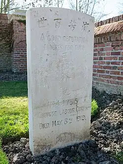 Wang Jungzhi is buried in plot II.O.54[2] in the Old Military Cemetery in Poperinge.[1] His headstone, in English and Chinese, includes the inscription "A good reputation endures for ever."