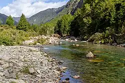 The eastern end of the track starts in the Wangapeka River valley 84 km (52 mi) south-west of Nelson, close to a campsite known as Siberia.[26][27] At the start of the track, there is a footbridge across the Rolling River. The track then follows the true right of the Wangapeka River. There are several tributaries to cross on the route, but these are bridged. The forest in this area is regenerating from the early attempts at clearing the land for grazing. There is a bridge across the north branch of the Wangapeka River at the junction with Kiwi Stream, and from this point the route follows the true left of the Wangapeka River to Kings Creek Hut.[28]