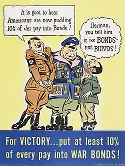 Aside from movies and music, there were countless other programs held throughout the states to encourage the purchasing of war bonds. One such promotion that was held, at the least, in Nebraska and Montana, allowed for citizens to "get Hitler's goat," a play on the phrase "to get someone's goat" meaning to make someone angry or annoyed. The goat would be held up for "auction" with the money going directly towards war bonds.[45] According to one source, the auctioning of "Hitler's goat" in Nebraska in 1942 raised $90,000 in War Bond sales.[46]