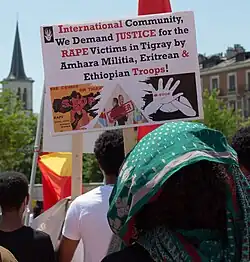 War rape and sexual violence were widespread throughout the war, and was perpetrated by virtually all sides.[24][25] According to one witness in May 2021, girls as young as 8 and women as old as 72 were among those being raped.[26] Such sexual violence was often accompanied by other forms of physical and mental abuse. Physical abuses included burning their victims with hot iron or cigarettes, forcing metal rods or nails into their victim's genitals, etc.[27][25] Mental abuses included raping their victim in front of their family members, forcing their victims to rape their family members, calling their victims derogatory words and ethnic slurs, etc.[28][27] After being subjected to sexual violence, many women became infected with STIs like HIV, and often found difficulty seeking treatments due to a combination of shame and the collapse of medical infrastructure due to the war.[29]
