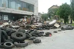 Early in the morning on 7 May, the National Guard retook the city administration in Mariupol after heavy fighting with insurgents overnight.[141] Anti-government demonstrators said that government forces had used tear gas during the operation, resulting in injuries when the demonstrators tried to re-occupy the building after the National Guard withdrew.[142] By the morning of 7 May, the flag of the DPR was once again flying over the building.[142] Clashes between government forces and pro-Russian groups escalated in early May when the city administration building was briefly retaken by the Ukrainian National Guard. The pro-Russian forces quickly took the building back.[143] Militants then launched an attack on a local police station, leading the Ukrainian government to send in military forces. Skirmishes between the troops and local demonstrators caused the city administration building to be set on fire. Government forces were unsuccessful in forcing out the pro-Russians, and only further inflamed tensions in Mariupol.[143]