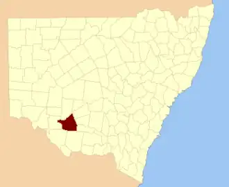 | Wilgah | Hay Shire Council | 34°36′54″S 145°05′04″E / 34.61500°S 145.08444°E / -34.61500; 145.08444 (Wilgah Parish) |