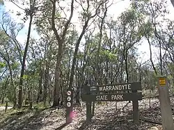 Warrandyte State Park is a state park, located in Warrandyte, east of Melbourne, Victoria on the banks of the Yarra River and surroundings. The park comprises 586 hectares of remnant bushland in various locations throughout Warrandyte and Wonga Park around Pound Bend, Fourth Hill, Black Flat, Yarra Brae and various other locations in the area. It hosts many significant geographical, environmental, archaeological and historical sites, such as the site of the first gold discovery in Victoria in 1851 and preserves the sites of former gold mines and tunnels. It is a popular destination for school and community groups and is frequented by local bush walkers and hikers.[1]