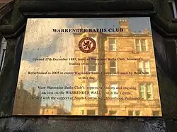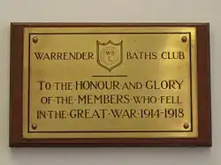 In 1906 Warrender Baths closed for economic reasons but the Club carried on at Portobello swimming pool. In 1908, Edinburgh Corporation purchased the site and opened the baths to the public. Warrender Baths Club returned to its original location[3] and in 1910 a ladies section was formed.[6] The club wound down activities during World War I as all senior club members joined the forces. A plaque in the front lobby of Warrender Baths commemorates those who died in this war – one, David McGregor, was awarded Britain's highest award for valour, the Victoria Cross.[6][7]