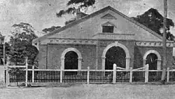 When Warringah Shire Council was formed in 1906, the Council first met in the Narrabeen Progress Hall on 14 June 1906, before moving to Brookvale.[1] From March 1907 the Council leased "Smith's Hall" (later to be known as "Empire Hall") in West Street, Brookvale from Mr W. Smith to act as their council chambers.[2] On 26 February 1910, a more permanent chambers was built on Pittwater Road, facing the land that would soon become Brookvale Oval. The opening was conducted by Shire President Alexander Ralston and was attended by Dr. Richard Arthur, Member for Middle Harbour.[3] This first Council Chambers was a small Federation Bungalow style building which served both as council offices and the Shire Clerk's residence.