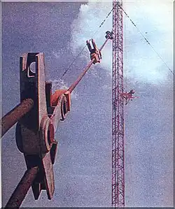 The Warsaw radio mast was a guyed steel lattice mast of equilateral triangular cross section, with a face width of 4.8 metres (16 ft). The vertical steel tubes forming the structures of the mast had a diameter of 245 millimetres (10 in); the thickness of the walls of these tubes varied between 8–34 mm (0.31–1.33 in) depending on height. The mast consisted of 86 sections, each of which had a length of 7.5 metres (25 ft). The mast had 3 arrays of guy wires, each array attached to the mast at 5 levels: 121.78 metres (399.5 ft), 256.78 metres (842.5 ft), 369.28 metres (1,211.5 ft), 481.78 metres (1,580.6 ft), and 594.28 metres (1,949.7 ft) above ground.[11][5] Each guy was fixed on a separate anchor block at the ground and was 50 millimetres (2.0 in) in diameter. To prevent the guy wires from interfering with the radio transmissions, the guys were insulated at regular intervals. The weight of guys and insulators used to anchor the mast was 80 tonnes (180,000 lb).[12][13] An elevator and separate protected ladders were installed in the interior of the mast to facilitate access to the various mast components, including the aircraft warning lamps. The elevator was designed by Alimak Hek, a Swedish company, and took 45 minutes to reach the top. The lift was nicknamed "Alimak", as a nod to the company that designed it. Safety was a priority, so "Alimak" was provided with an emergency stop function, but no incidents occurred that might have required it. A maximum of 3 people could ride up the elevator, although sources claim 3 people would have felt crowded. The elevator was powered by an internal combustion engine. An area for maintenance supplies was present, in order to transport materials such as lightbulbs for the aircraft warning lights. Inspection crews travelled up it once per month to replace light bulbs, and to watch for cracks in the steel. If a crack was found, the transmitters were turned off and the Raszyn radio mast took over the broadcast. Any cracks were then fixed by welders from Mostostal Zabrze by patching them with sheet metal.[14]