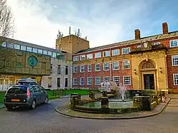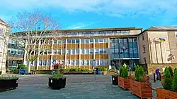 The building was brought up to its current size by construction of a new council chamber and further offices in 1958 and a final expansion in 1966, which included a new frontage and main public entrance for the complex facing Market Place. The latter two developments are classic examples of Brutalist architecture.[11][2] The Queen Elizabeth The Queen Mother officially opened the extension on 3 November 1966.[12]
