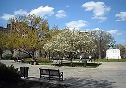 The American Civil War was fought from 1861 to 1865 and Washington Circle was an instrumental location for the Union Army during the war.[1]: 164–186 In 1862, streetcars tracks were laid around Washington Circle, but were not properly maintained during the turbulent years of the Civil War. Track improvements were made during the 1870s and the park was redesigned in 1885. These tracks were used to transport war weapons and machineries for war efforts. Also the south of the circle along 23rd street was used as a Union army encampment, named Camp Fry. Camp Fry served as a camp for wounded soldiers to recuperate.[6] After the civil war, the camp was dismantled. St. Paul's Episcopal church, popularly known as Old St. Paul's Church was built in 1866 and was the first church built around the circle at the corner of 23rd street. With the influx of the African American population after the civil war, the church was built to act as a form of missionary to the people.[7] St. Ann's Infant Asylum was also present during the 1860s and it occupied the building that the British Legation once occupied.