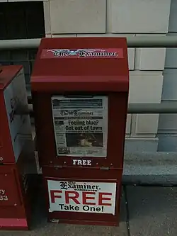 From 2005 to 2013, the Examiner was published as a daily tabloid-sized newspaper, distributed throughout the Washington, D.C. metro area. The newspaper focused primarily on local news and political commentary.[4] The local newspaper ceased publication on June 14, 2013, whereupon its content began to focus almost exclusively on national politics from a conservative point of view. The Examiner switched its print edition from a daily newspaper to an expanded print weekly magazine format.[5][6][7]
