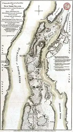 During the New York Campaign of the Revolutionary War, General George Washington's Continental Army secured a small but much-needed victory over the pursuing British Army at the Battle of Harlem Heights, after having suffered a series of defeats in Manhattan.[17]: 56 [18]: 102 Not long after their victory, the Continental Army suffered one of its worst defeats at the Battle of Fort Washington, in which nearly 2,900 troops were captured.[19]: 165 Fort Washington was a group of fortifications on the high points of Washington Heights, with its central site at present-day Bennett Park (known then as Mount Washington)[16]: 737 built a few months prior opposite Fort Lee, New Jersey to protect the Hudson River from enemy ships.[9]: 229 [15]: 2 [18]: 111