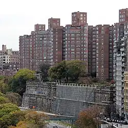 The neighborhood's largest estate was the property of industrial tycoon C. K. G. Billings, taking up 25 acres (10 ha) in the southern part of Fort Tryon Park.[22]: 20 [29] Although the Louis XIV-style mansion at present-day Linden Terrace burned to the ground in 1925, Billings Terrace remains, supported by the elegant stone archway that originally led to the Billings mansion.[15]: 10 [30]