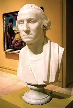 Portraits of Washington on medals and in other media subsequent to the sculptor's visit were most often based on Houdon's work, beginning with the 1786 "Washington Before Boston" medal engraved by Pierre Simon DuViviers. Although only one American, Abraham Lincoln, had appeared on a circulating US coin by the 1920s, the Houdon bust had been used as the basis of the portrait of Washington on the commemorative Lafayette dollar dated 1900 and on the Sesquicentennial half dollar of 1926. According to coin dealer and numismatic historian Q. David Bowers, the Houdon bust, even then, was the most common representation of Washington on coins and medals.[5] Little is known of Flanagan's creative process, although models of Flanagan's quarter with a different portrayal of Washington, facing right, and with a different eagle, have come on the market.[8] Flanagan's adaptation differs from the Houdon bust in some particulars: for example, the shape of the head is different, and there is a roll of hair on the quarter not found on the bust.[17]